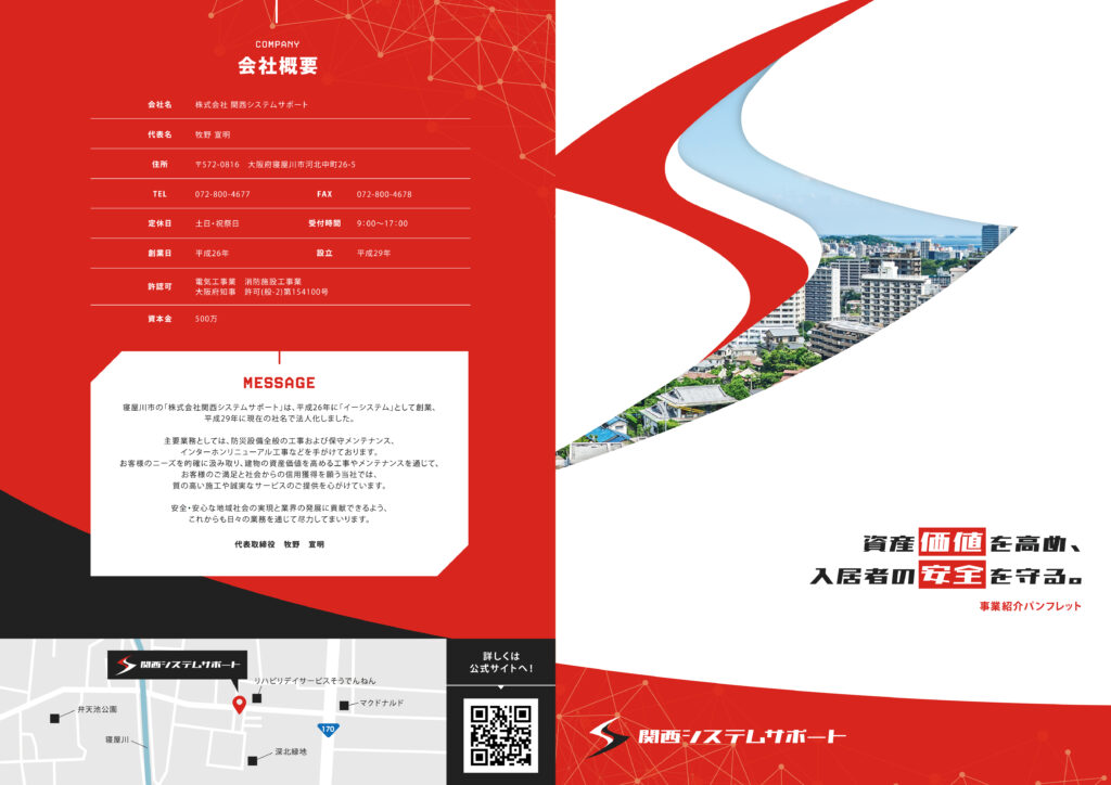 関西圏を中心に、防災・防犯・通信インフラ分野で信頼を築いてきた「関西システムサポート」様の事業紹介パンフレットを制作しました。